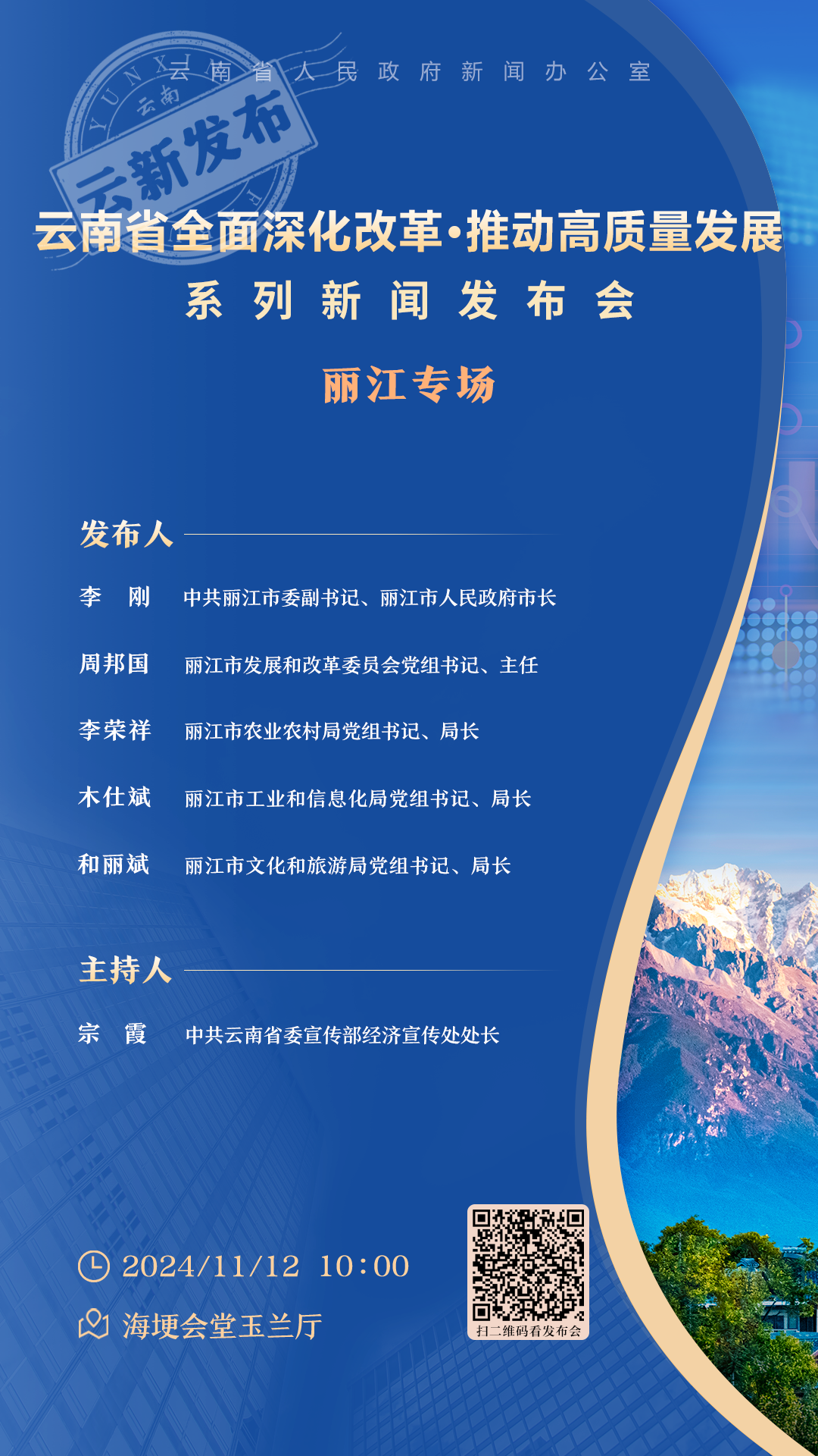 云南省人民政府新闻办公室定于2024年11月12日(星期二)上午,在云南海埂会堂玉兰厅,召开云南省全面深化改革·推动高质量发展系列新闻发布会·丽江专场,邀请丽江市人民政府主要负责同志介绍相关情况并回答记者提问。